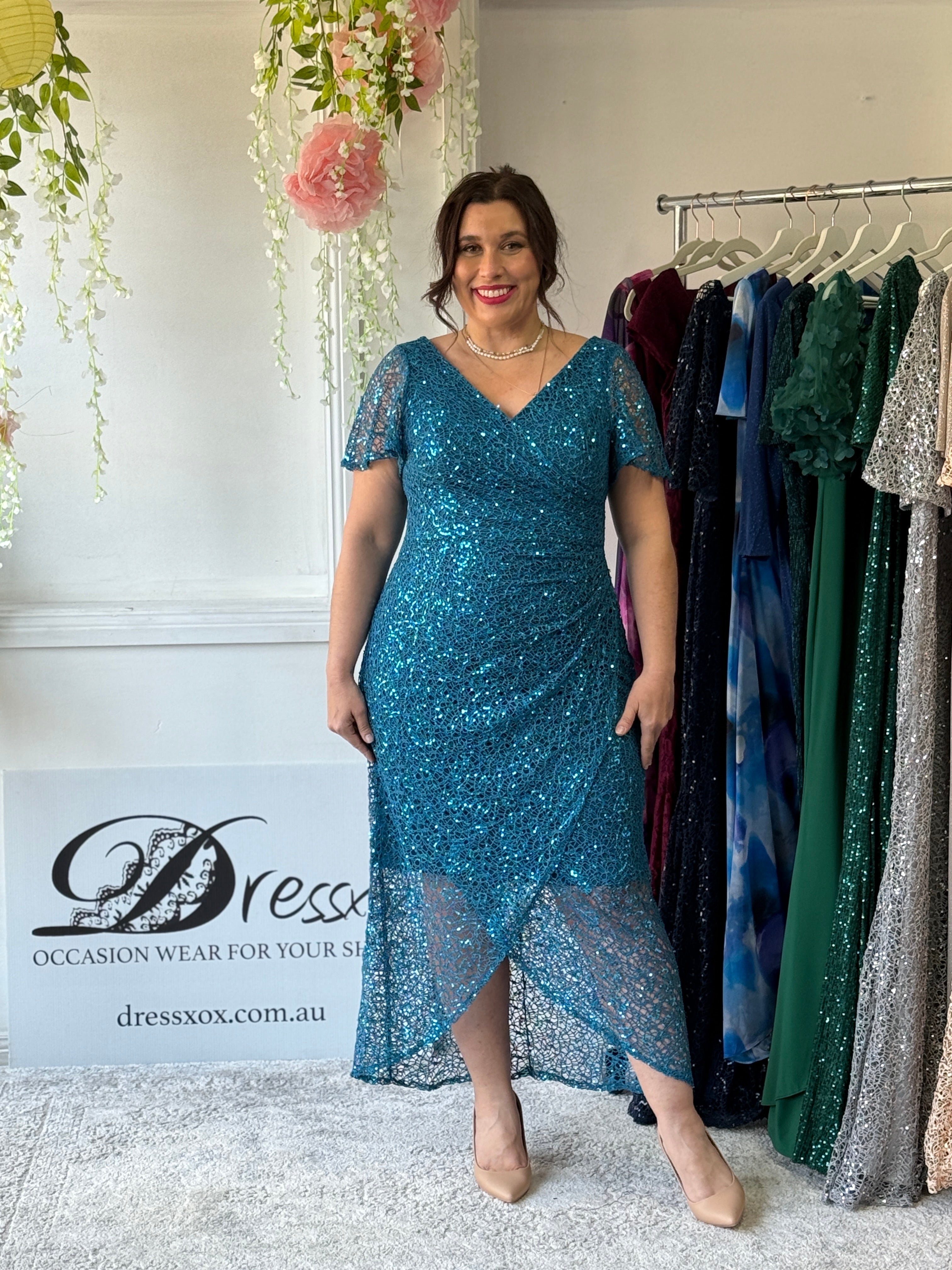 Stand out from the crowd in this sequin dress. Made in an exquisite crochet fabric embellished with sequins which is soft and not itchy at all. Ruching at the side hide help hide the tummy area. *Similar to our Alana dress but longer inside layer.