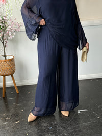 This luxurious design is the perfect addition to your wardrobe. Designed and Made In Italy, these elegant silk pants are so comfortable and easy to wear. This wide leg layering pants style is made in a comfortable jersey with a silk chiffon overlay, featuring a wide waist band for a secure and snug fit. Complete the evening look with one of our Silk Tops> .