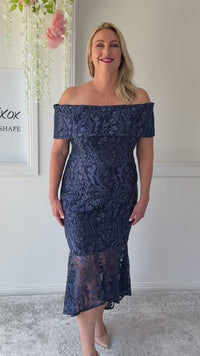 Navy polyester embroidered tulle, full jersey lining, elasticated straps, invisible zip at centre back